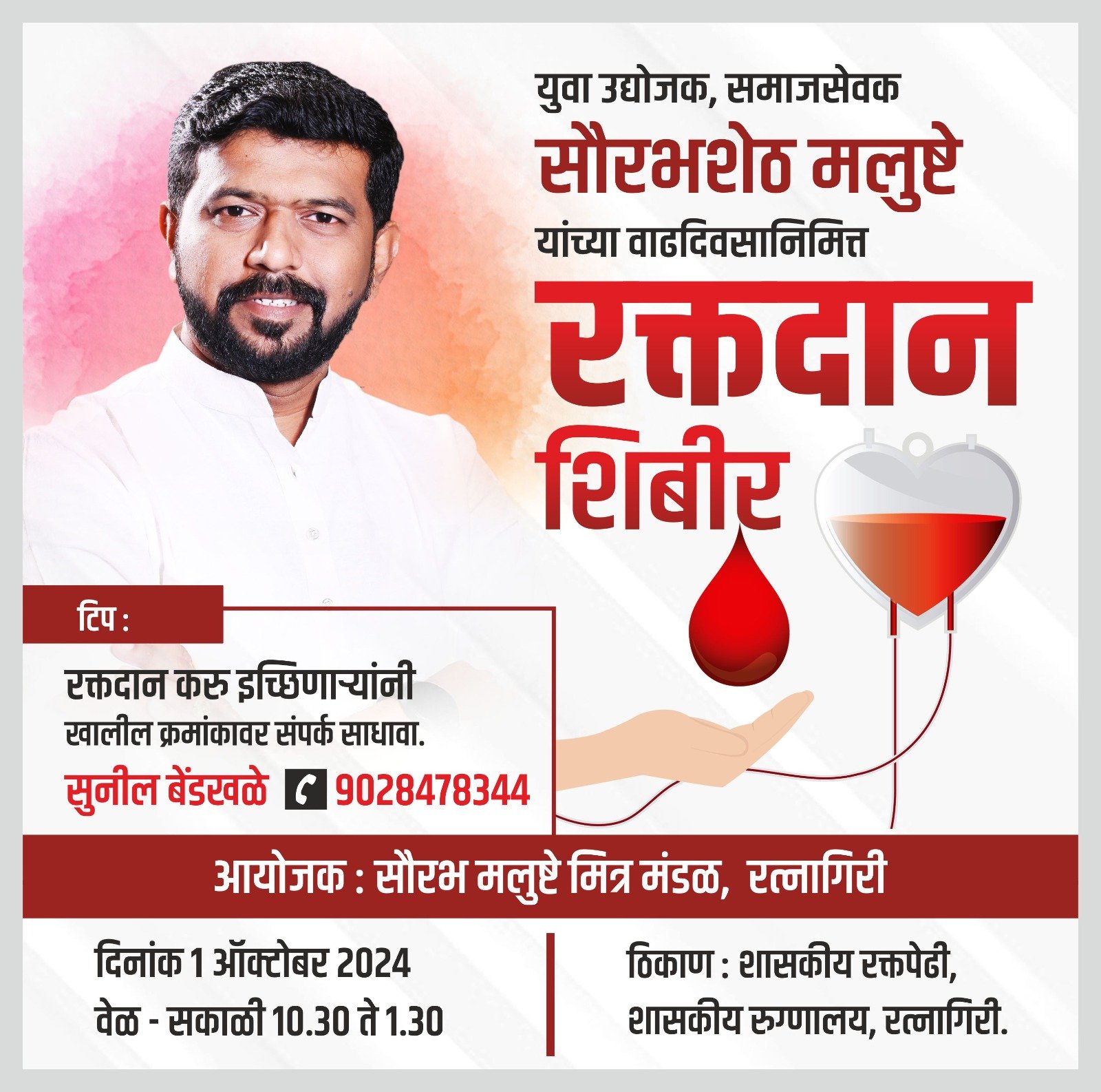 रत्नागिरी : उद्योजक सौरभ मलुष्टे यांच्या वाढदिवसानिमित्त मंगळवार १ ऑक्टोबर रोजी रक्तदान शिबिराचे आयोजन करण्यात आले आहे. शासकीय रुग्णालयातील शासकीय