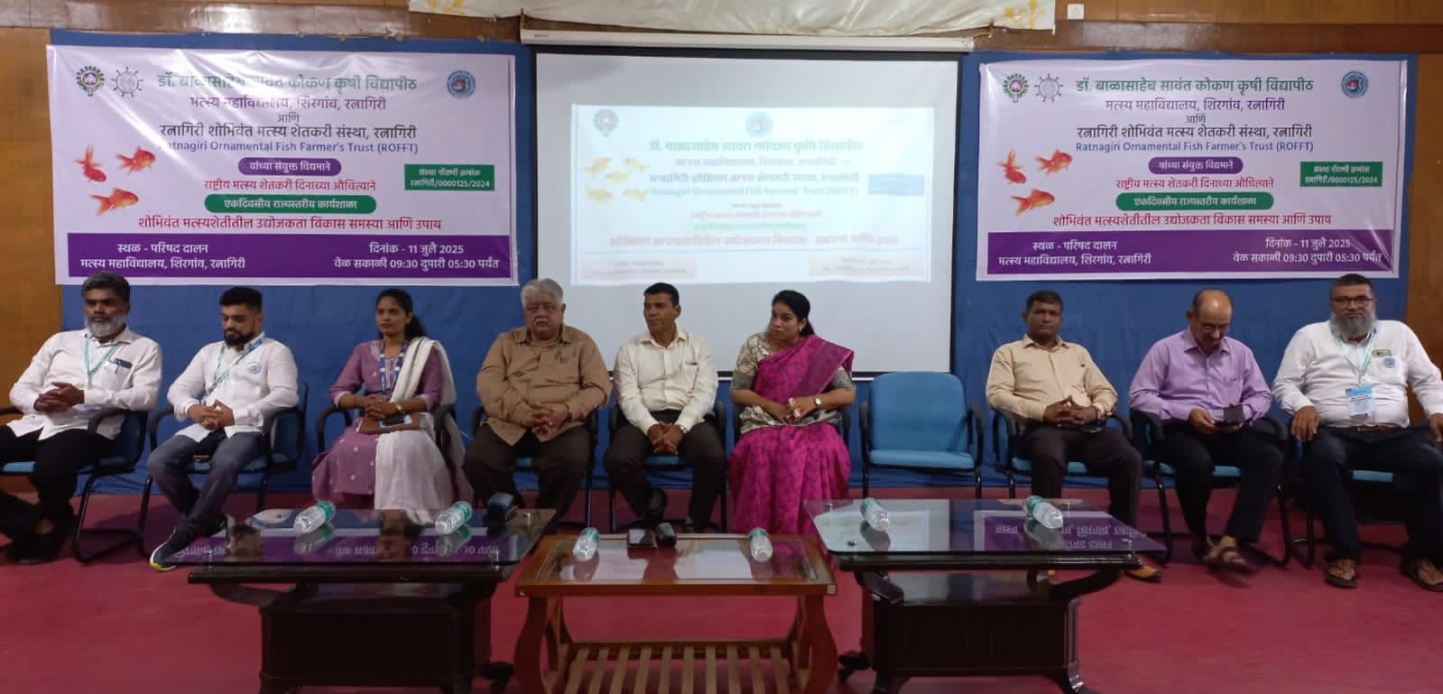 रत्नागिरी:- राष्ट्रीय मत्स्य शेतकरी दिनाच्या औचित्याने डॉ. बाळासाहेब सावंत कोकण कृषि विद्यापीठ चे मत्स्यमहाविद्यालय, शिरगाव, रत्नागिरी आणि रत्नागिरी शोभिवंत मत्स्य शेतकरी संस्था, रत्नागिरी यांच्या संयुक्त विद्यमाने एक दिवसीय राज्यस्तरीय कार्यशाळा दिनांक ११ जुलै रोजी परिषद दालन, मत्स्य महाविद्यालय, शिरगाव येथे आयोजित करण्यात आली होती. या कार्यशाळेच्या उद्घाटन कार्यक्रमाचे अध्यक्षस्थान मत्स्य महाविद्यालय शिरगांव रत्नागिरी चे सहयोगी अधिष्ठाता डॉ. अनिल पावसे यांनी भूषविले. याप्रसंगी व्यासपीठावर केंद्रीय मत्स्यिकी शिक्षण संस्था, मुंबई च्या शास्त्रज्ञ डॉ. माधुरी पाठक, मत्स्य व्यवसाय विकास अधिकारी (मिरकरवाडा प्राधिकरण) कु. अक्षया मयेकर, सागरी पदार्थ निर्यात विकास प्राधिकरणाचे श्री. मंगेश गावडे,