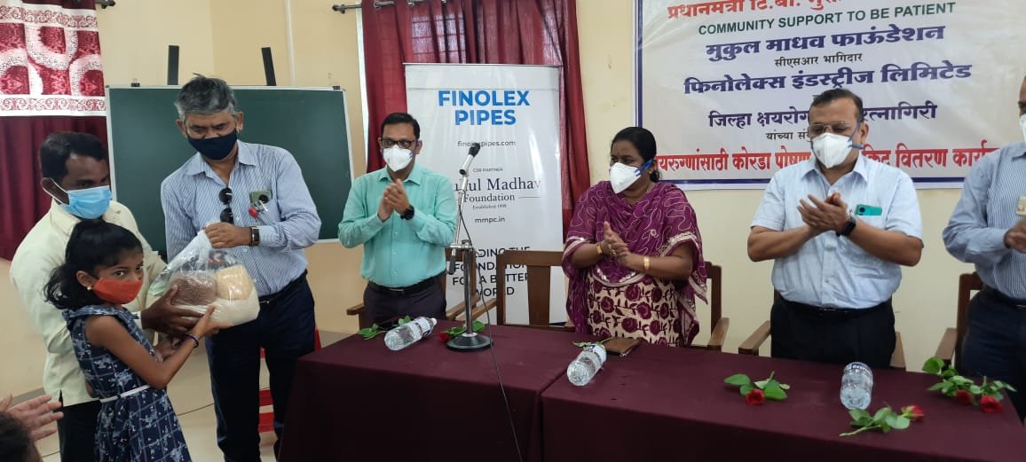 माननीय पंतप्रधान श्री नरेंद्रजी मोदी यांच्या संकल्पनेतून 2025 पर्यंत भारत क्षयरोग मुक्त करण्याचे उद्दिष्ट पूर्ण करण्यासाठी राष्ट्रीय क्षयरोग निर्मूलन कार्यक्रमानुसार जिल्हा क्षय अधिकारी रत्नागिरी यांचेकडून आवाहन प्राप्त झाले. फिनोलेक्स इंडस्ट्रीज आणि मुकुल माधव फाऊंडेशने आवाहनाला सकारात्मक प्रतिसाद दिला आणि रत्नागिरी जिल्ह्यातील 203 रुग्णांना पौष्टिक रेशन किट दानासाठी दत्तक घेतले. आज दिनांक ४ एप्रिल रोजी जिल्हा प्रशिक्षण केंद्र रत्नागिरी येथून वितरण मोहिमेला सुरुवात झाली.